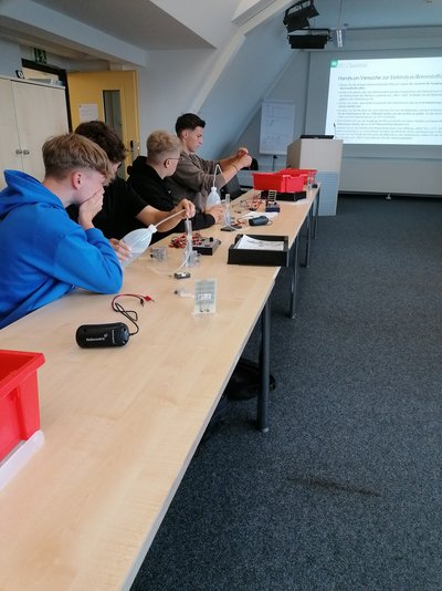 Das Fachseminar Energie im 12. Jahrgang des Werner-von-Siemens-Gymnasiums aus Bad Harzburg hat am 10.09.2024 das EST besucht. Neben einer allgemeinen Vorstellung von M. Eng. Marcel Thiele zu den Aktivitäten des Forschungszentrums Energiespeichertechnologien zu aktuellen und kommenden Herausforderungen im Energiesystem und der Integration von Energiespeichertechnologien, hat Dr.-Ing. Andreas Lindermeir vom CUTEC-Forschungszentrum der TU Clausthal die Schüler:innen mit einem Elektrolyse-Brennstoffzellen-Experimentierkasten unterhaltsam in die zukünftige Energieversorgung mit Wasserstoff eingeführt.