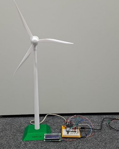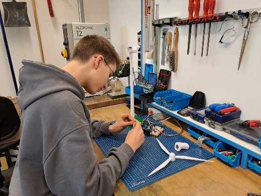 So hat Felix Pape ein Konzept für ein motorisiertes Windrad entwickelt, das nun als Schaustück für Informationsmessen im Bereich erneuerbarer Energiesysteme eingesetzt werden kann. Die kunststoffbasierten Bauteile wurden von ihm selbstständig im 3D-Druck gefertigt. Zudem programmierte er eine Motorsteuerung mit digitaler Anzeige und integrierte eine LED, um das Windrad voll funktionsfähig zu präsentieren.
