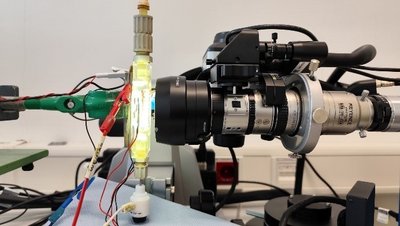 Messaufbau zur in-situ Untersuchung der Eisen-Redox-Flow-Batterie unter einem 3D-Lichtmikroskop. © Marina Becker
